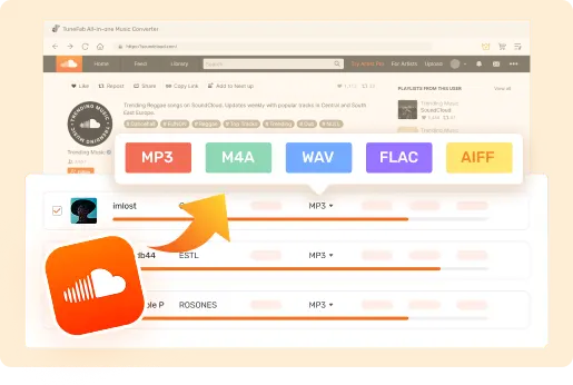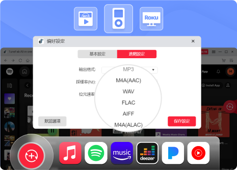 透過 TuneFab All-in-One 音樂轉檔器,你可以將各個平台的串流歌曲下載轉換為 MP3、M4A、WAV、FLAC、AIFF、AAC 和 ALAC 等不同的音訊檔案。